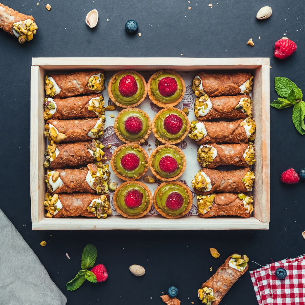 křupavá rolka (těsto), ricotta, mascarpone, cukr, pistácie, máslové košíčky, pistáciový krém, malina